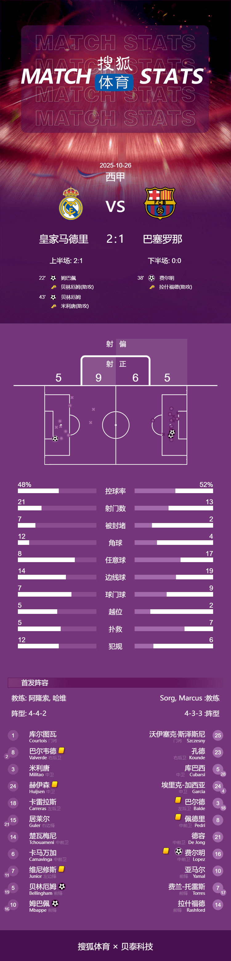 皇家马德里(4-4--2):1-库尔图瓦/8-巴尔韦德(72分钟,2-卡瓦哈尔)、3-米利唐、24-赫伊森、18-阿尔瓦罗-卡雷拉斯/5-贝林厄姆(90分钟,19-塞瓦略斯)、6-卡马文加、14-楚阿梅尼、15-居莱尔(66分钟,21-卜拉欣-迪亚斯)/10-姆巴佩(90分钟,16-贡萨洛-加西亚)、7-维尼修斯(72分钟,11-罗德里戈)